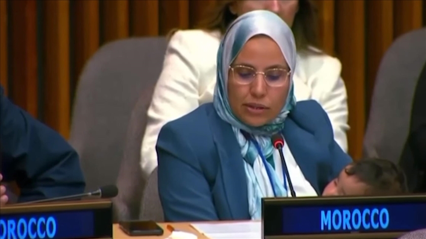 وهي تحمل رضيعها، ألقت المستشارة البرلمانية المغربية فاطمة زوكاغ كلمة في الأمم المتحدة ضمن أعمال الدورة الـ68 للجنة وضع المرأة المنعقدة في مقر المنظمة بنيويورك، في حدث لا يتكرر كثيرا في مثل هذه المحافل الدولية.