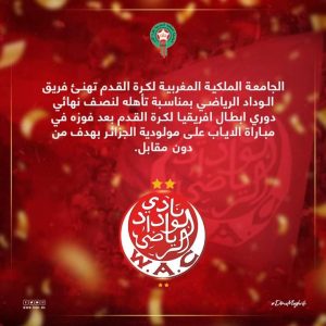 تقدم رئيس الجامعة الملكية المغربية لكرة القدم فوزي لقجع، و أعضاء المكتب المديري، بتهنئة فريق الجيش الملكي لكرة القدم النسوية، بعد تأهله لنهائي عصبة الإبطال الإفريقية لكرة القدم النسوية التي تحتضنها بلادنا. وتأهل فريق الجيش الملكي لكرة القدم النسوية، لنهائي عصبة الأبطال الإفريقية بعدما فاز بنتيجة هدف لصفر في المباراة التي جمعته مساء يومه الأربعاء […]