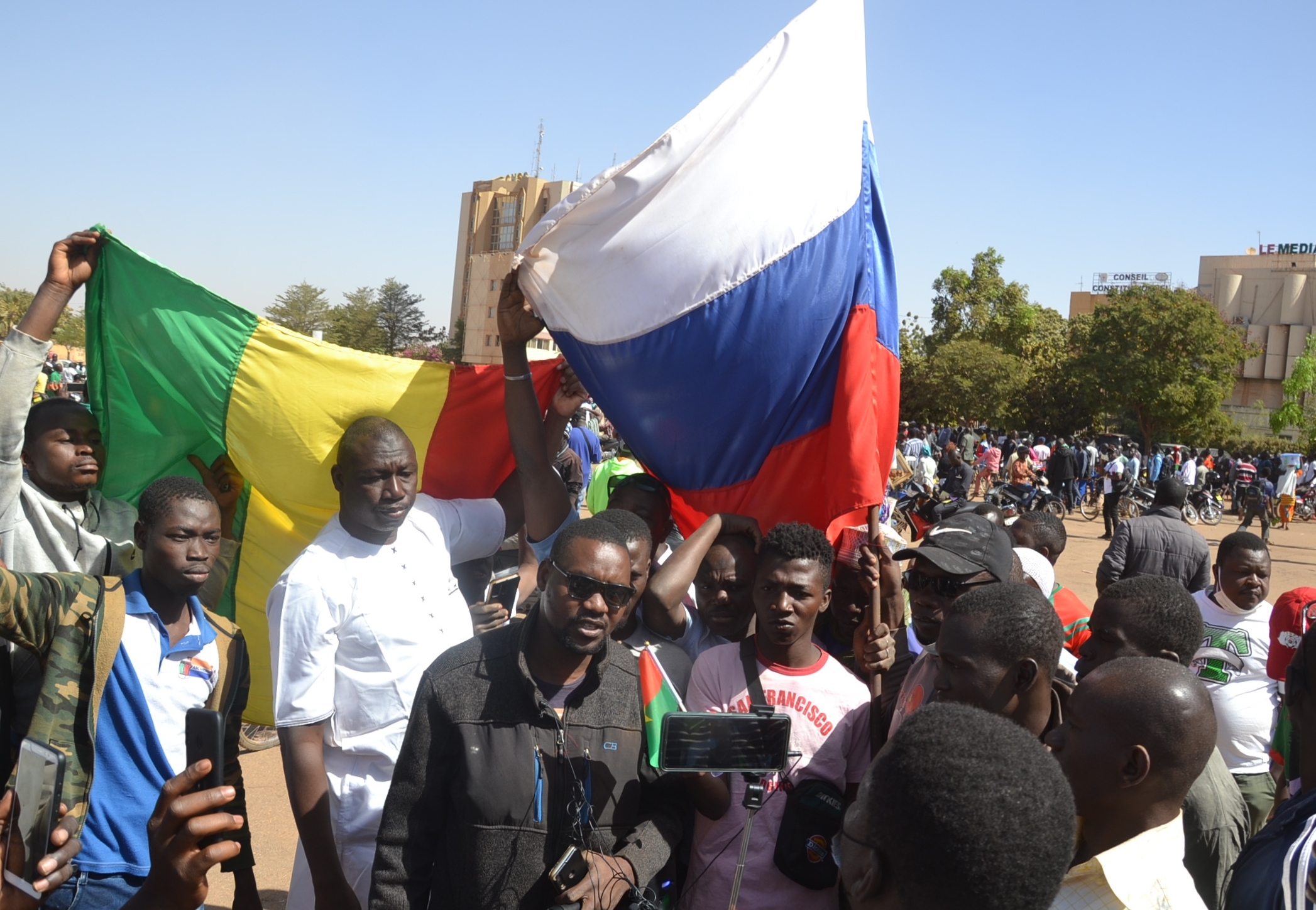 ورفع أغلب متظاهري الحركة التي ترأسها الناشطة السياسية والمترشحة الرئاسية السابقة مونيك يلي كام، الأعلام الروسية، وطالبوا بمغادرة السفير الفرنسي بواغادوغو لوك هولاد.