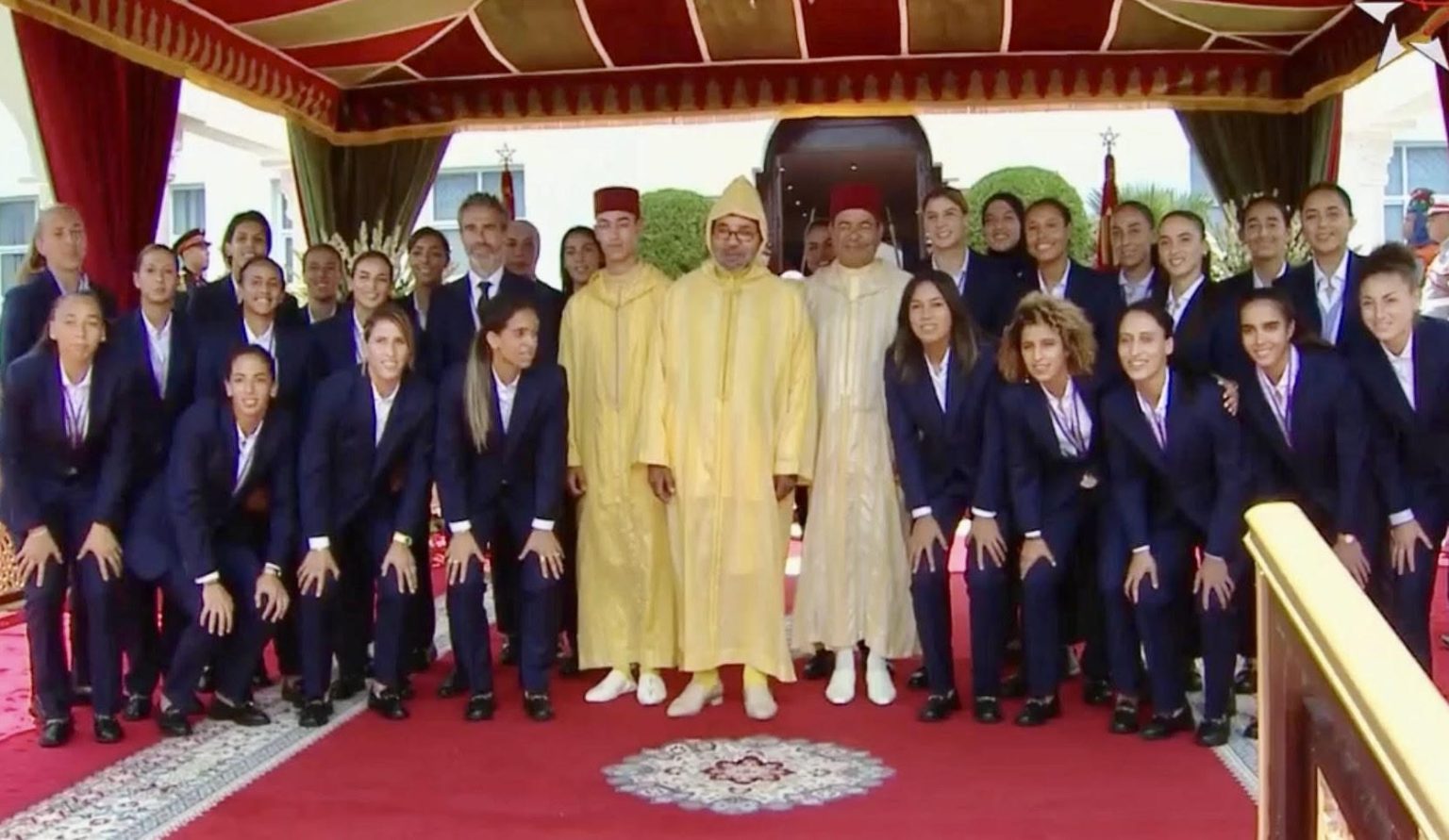 بعد ذلك، أخذت لصاحب الجلالة، مرفوقا بصاحب السمو الملكي ولي العهد الأمير مولاي الحسن، وصاحب السمو الملكي الأمير مولاي رشيد، صورة تذكارية مع أعضاء المنتخب الوطني النسوي لكرة القدم.